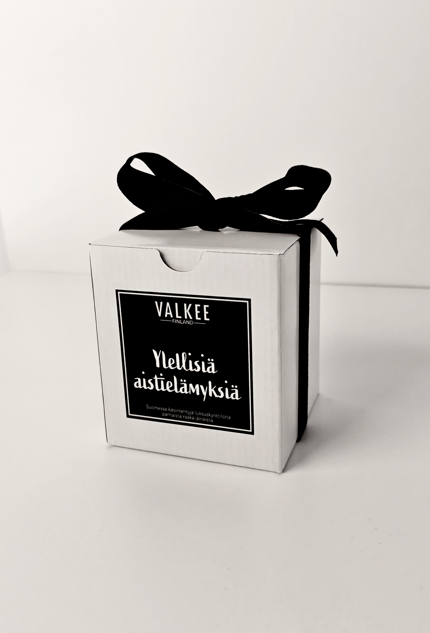 Kaikki Valkee tuoksutuotteet pakataan niiden ansaitsemiinsa näyttäviin pakkauksiin. Tämä tekee kynttilöistä entistä ihastuttavimman lahjan itselle tai rakkaalle.